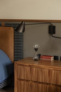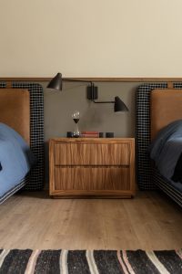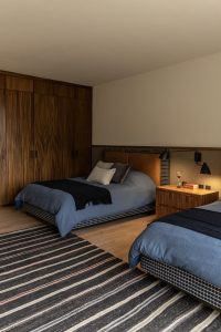 Un espacio contempor谩neo y acogedor que combina la calidez de la madera natural con el car谩cter elegante de textiles en tonos azul profundo. El dise帽o limpio y funcional integra iluminaci贸n puntual y detalles en cuero, creando una atm贸sfera equilibrada entre confort y estilo atemporal.